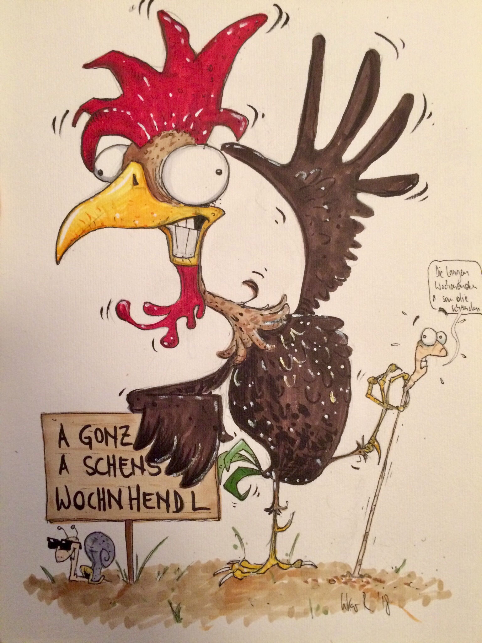 Schönes Wochen(h)ende(l) 11. Juni 2018gezeichnete Wortwitzehahn, hendl, langes wochenende, schönes, schnecke, wochenende, wurm, zu hause bleibenrainerlikar