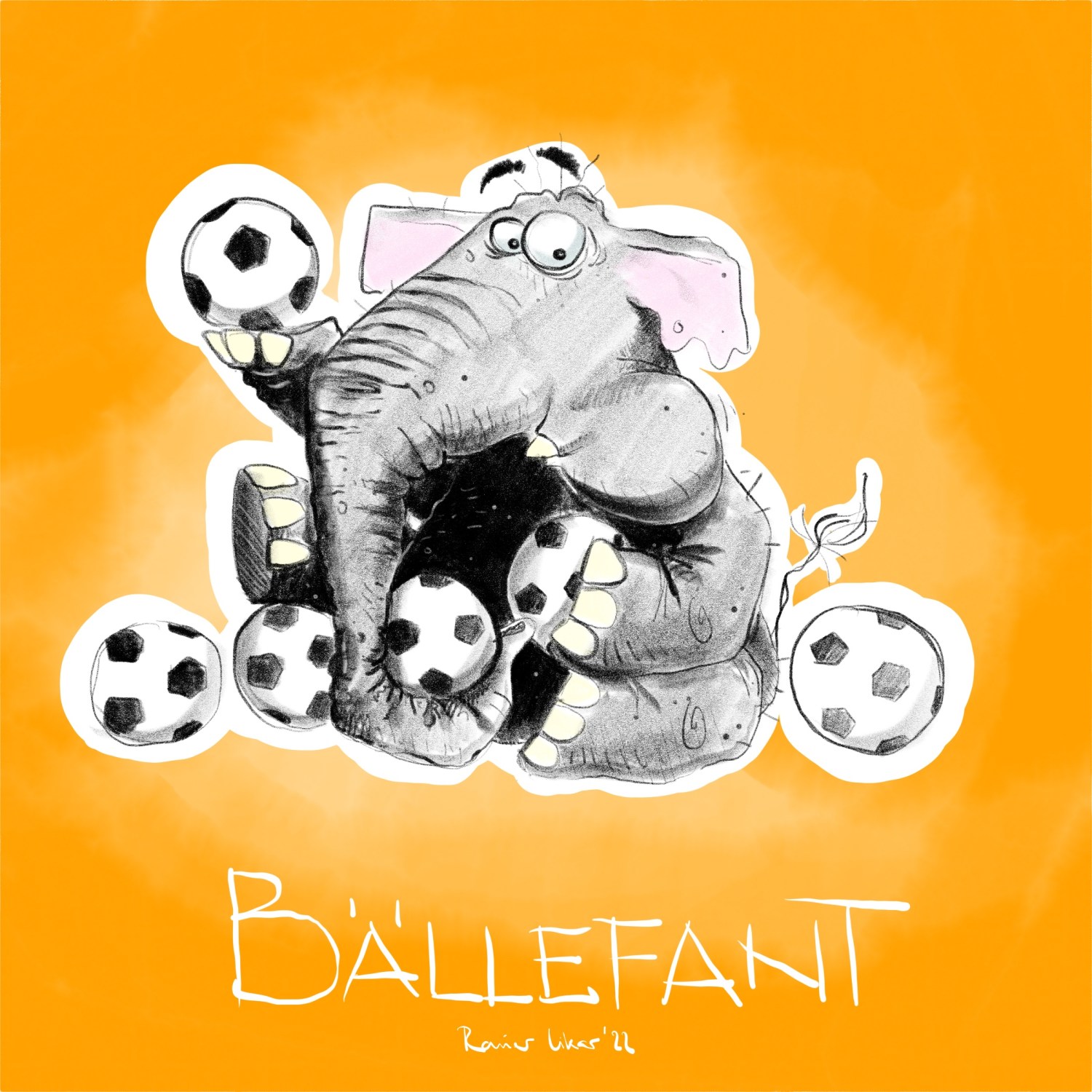 Bällefant 4. Juli 2022gezeichnete WortwitzeBall, Bild, Bilder, Elefant, essen, Fussball, grau, Illustration, orange, spass, Verrücktes, Zeichnung, Zeichnungenrainerlikar